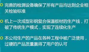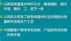公司是一家瞄準(zhǔn)國(guó)際、國(guó)內(nèi)市場(chǎng),集科、工、貿(mào)于一體的綜合性公司,擁有各類先進(jìn)的設(shè)備100余臺(tái)(套),公司自主研發(fā)了新型保溫材料及彩鋼復(fù)合保溫板材連續(xù)生產(chǎn)工藝,建成了機(jī)上一次成型彩鋼復(fù)合保溫板材的生產(chǎn)線...